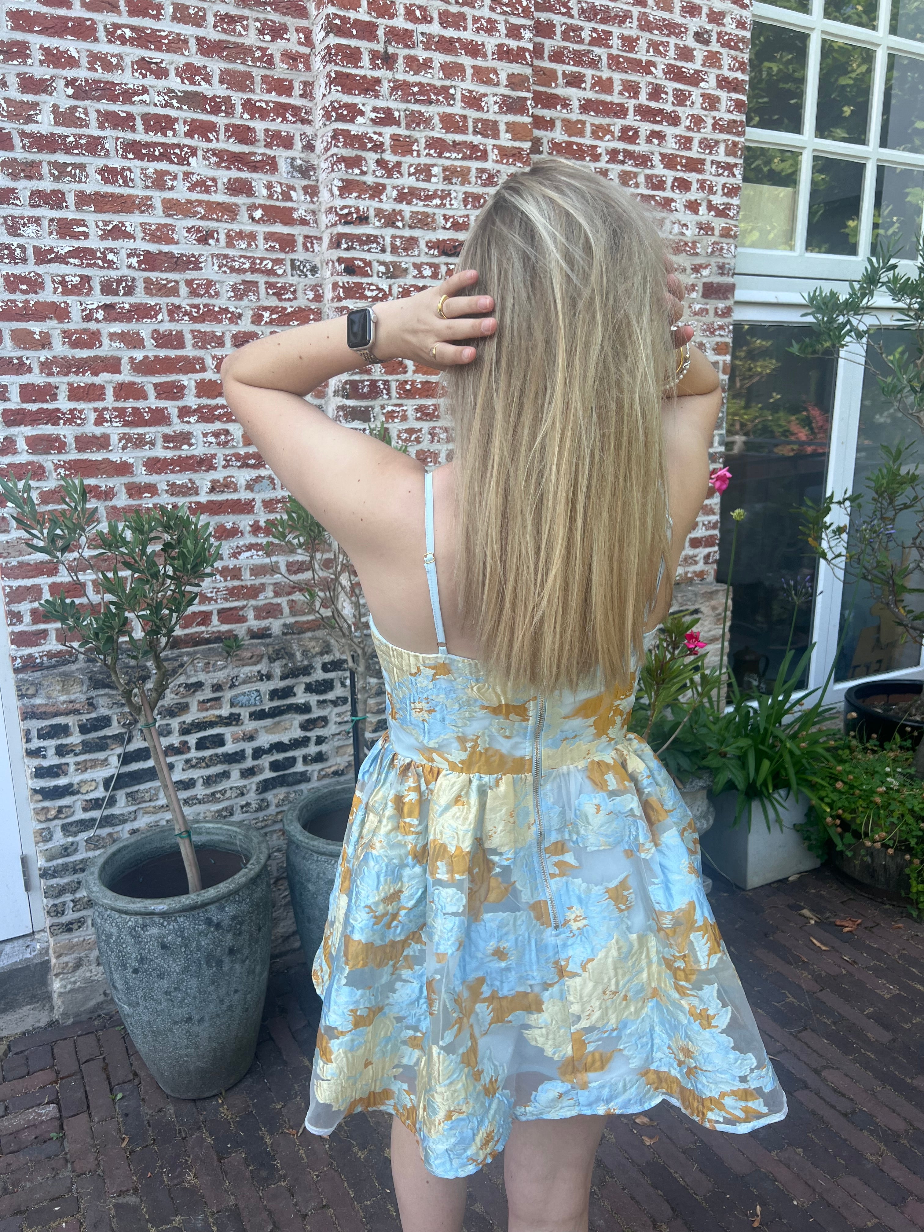 De golden bleu showpo dress. Opzoek naar een jurk met het thema mama mia of la dolce vita? huur dan deze jurk! Deze jurk heeft een wat smallere bovenkant en een wat wijdere onderkant. hierdoor kleedt deze jurk mooi af. Model op de foto is 167cm en draagt normaal M. Jurk valt tussen M en L.