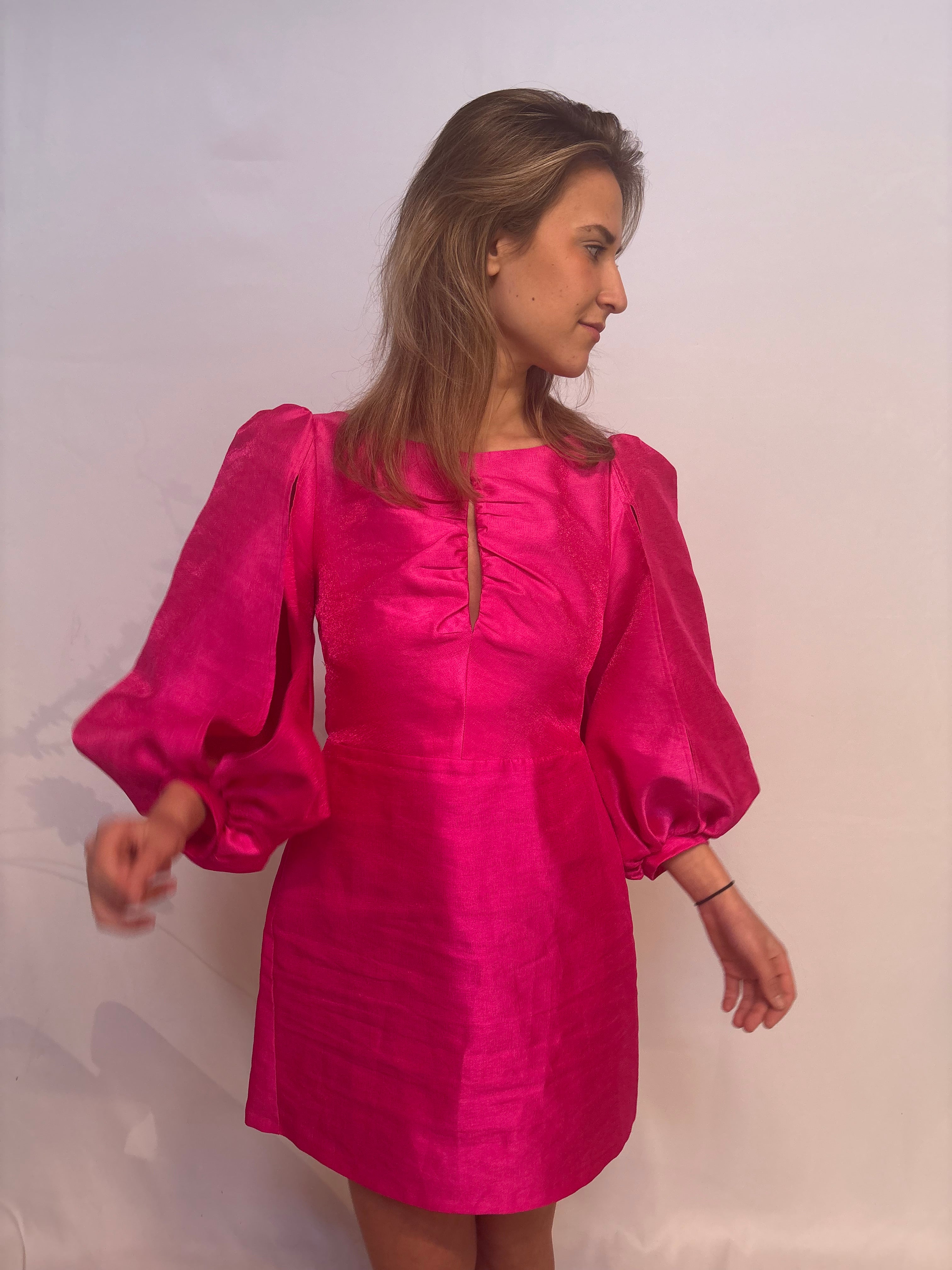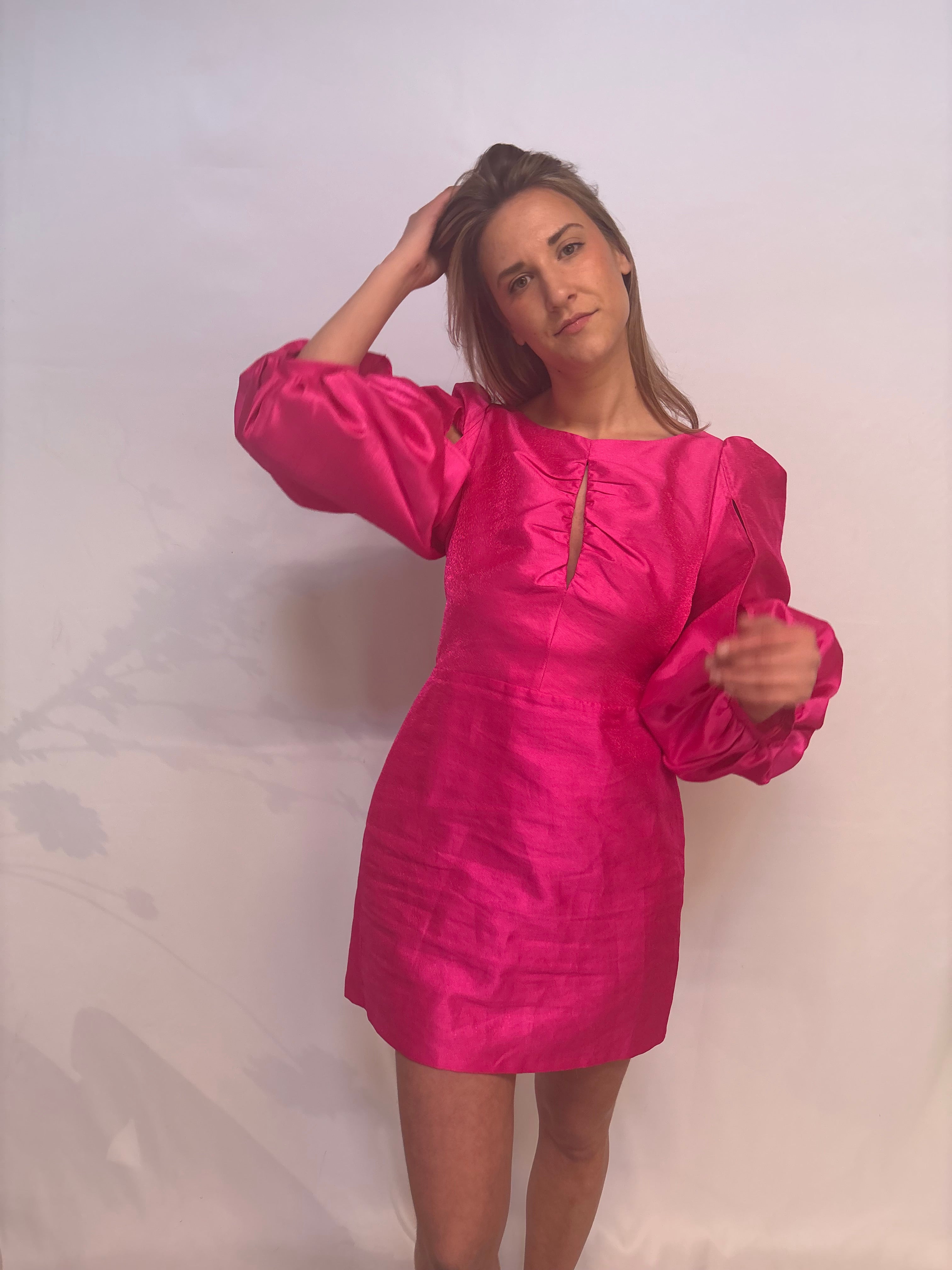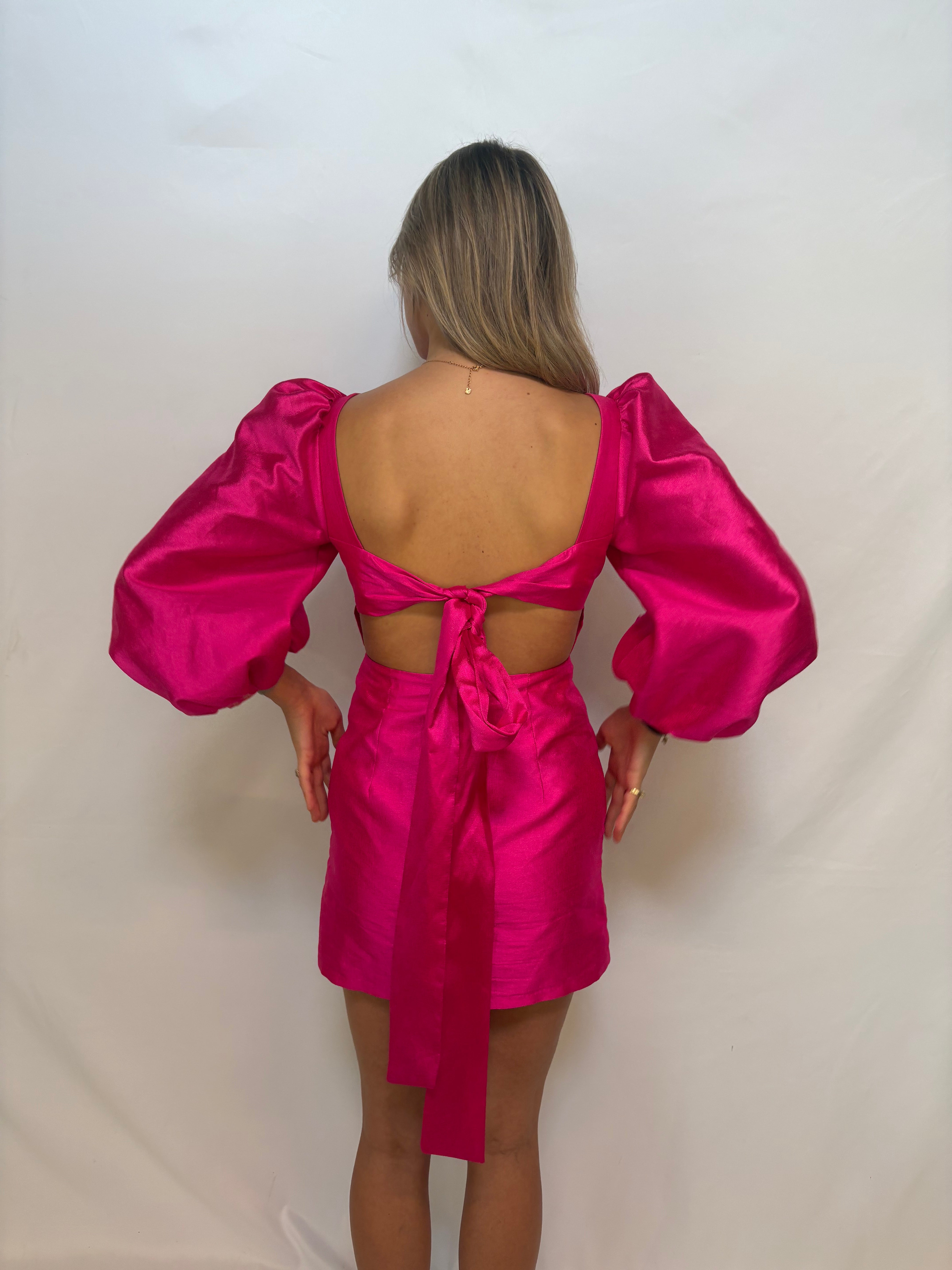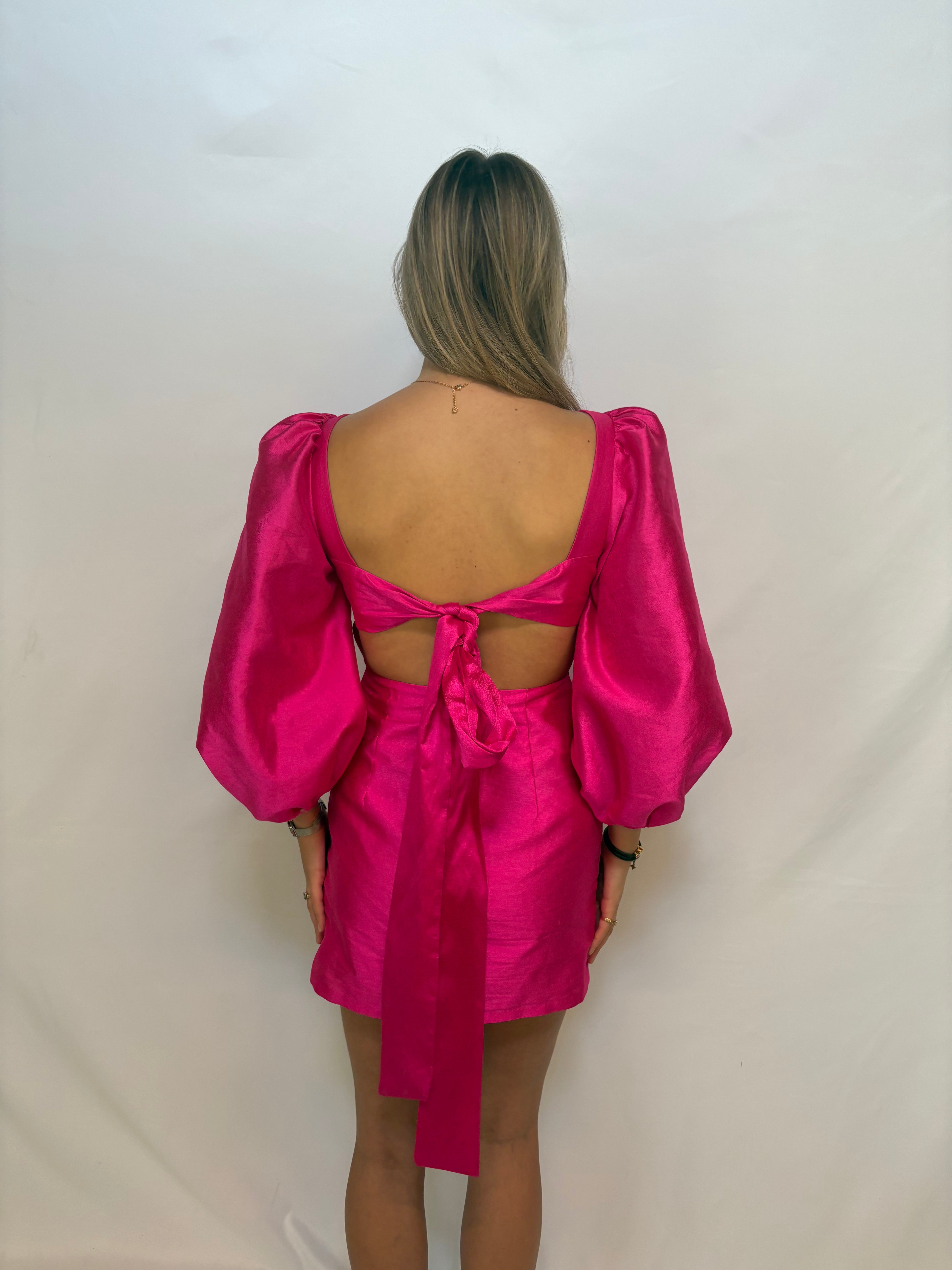 De roze laagam jurk. Met de prachtige kleur en de afwerking met de strik op de achterkant val jij echt op! Model op de foto is 178 cm en draagt normaal gesproken S. Draagt op de foto M.