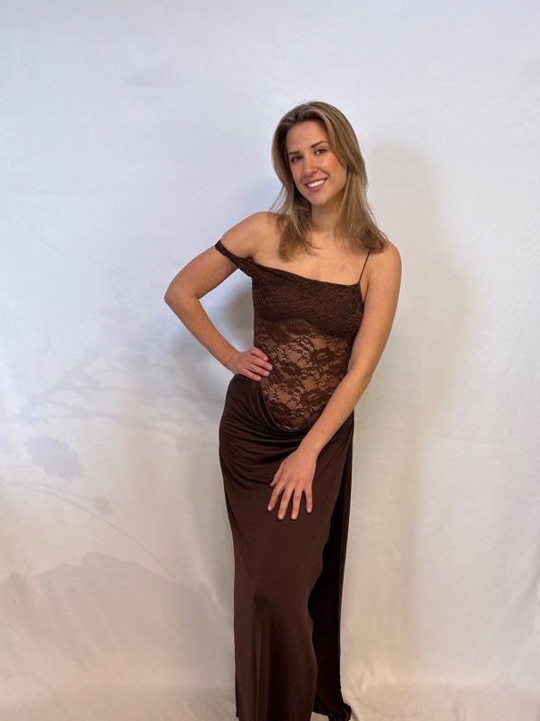 Deze maxi dress is ideaal voor wie op zoek is naar een stijlvolle, tijdloze en toch opvallende look. De warme bruine kleur, het verfijnde kant en de elegante split maken deze jurk uniek en flatterend. Perfect voor vrouwen die houden van een chique, vrouwelijke uitstraling met een moderne twist.