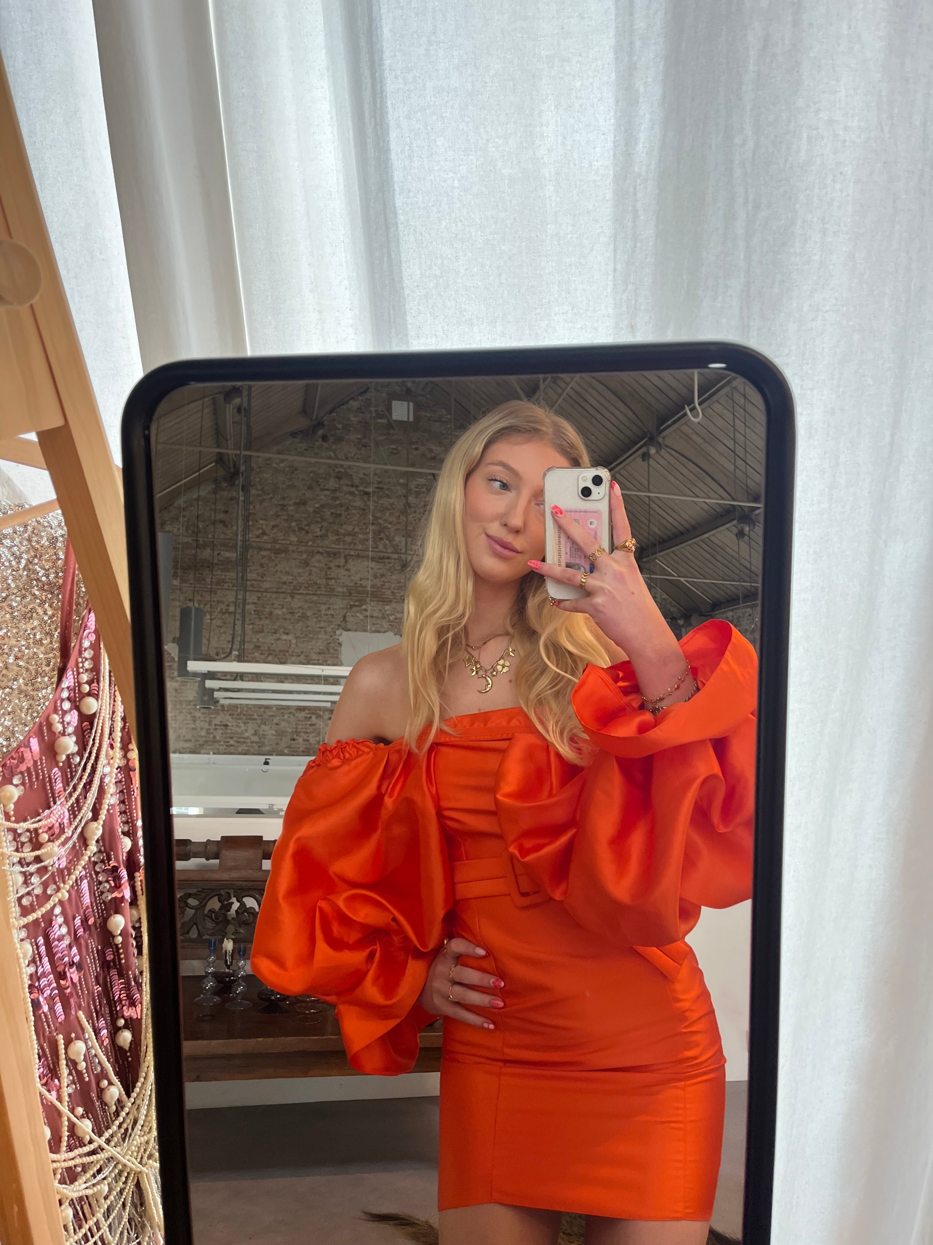 De asos robe off shoulder orange dress. met deze jurk en de kleur val jij echt op. de jurk heeft een chique strakke pasvorm met lange dramatische mouwen. Model op de foto is 179 cm en draagt normaal XS. de jurk valt redelijk krap uit.